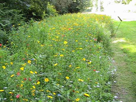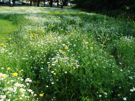 The Green Belt area by our house also had areas sown with wildflowers last year. It was mown in autumn for the seeds to drop and in spring this year l over-sowed the area by slitting the ground with a Sisis pierce. This made it easy to sow the seeds, which l mixed with dry sand then raked in with as little ground disturbance as possible. All seeds are up and looking good. We have also planted foxgloves among the wildflowers and at the side a brook that runs through the park we have a large area of ransom (wild garlic) with lovely white flowers.